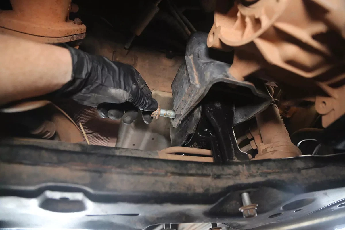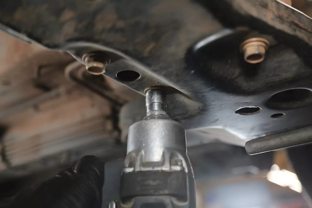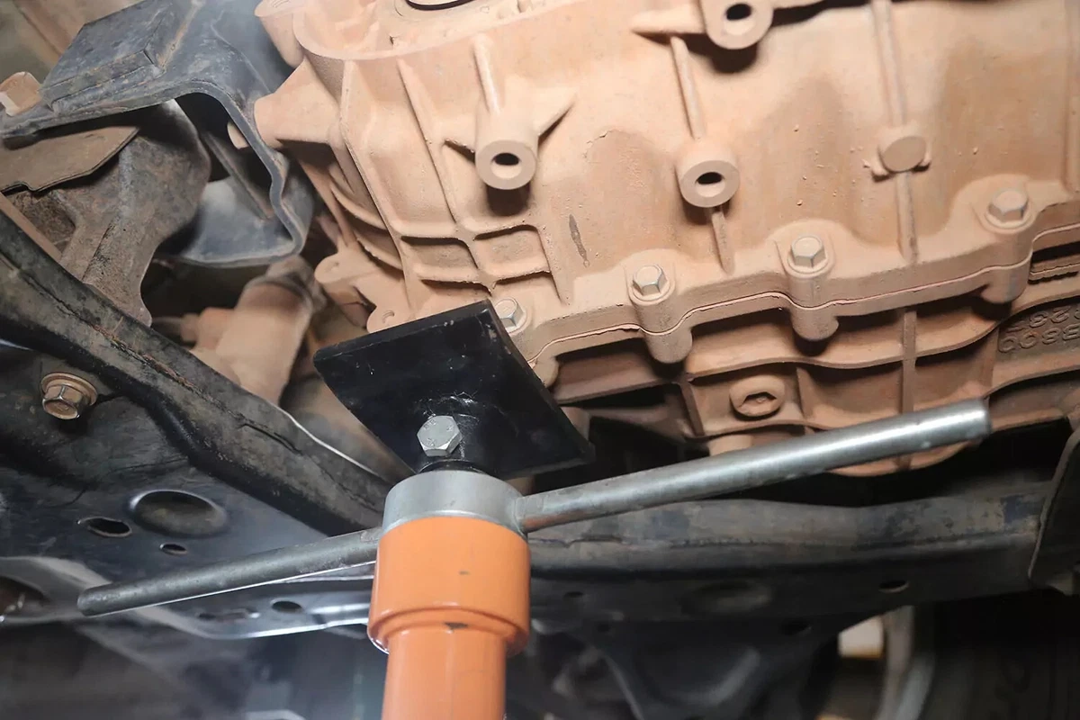 ہماری ڈیمو گاڑی کے لیے، ماؤنٹ کے ذیلی فریم پر تین بولٹ اور ٹرانسمیشن کے لیے ایک بولٹ ہے۔ چار مزید بولٹ ٹرانسمیشن ماؤنٹ بریکٹ کو ٹرانسمیشن سے منسلک کرتے ہیں۔ زیادہ تر گاڑیوں پر، ان کو ہٹانے کی ضرورت نہیں ہے۔