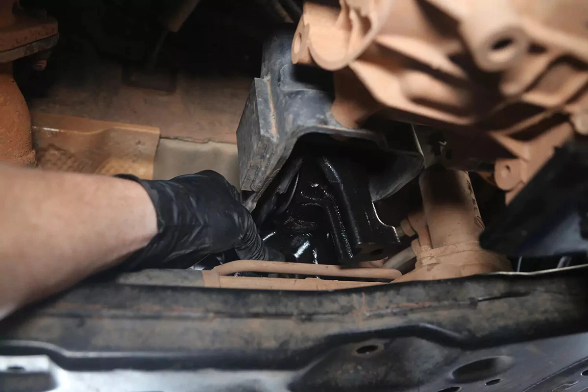 ہماری FWD ڈیمو گاڑی پر، ٹرانسمیشن ماؤنٹ فرنٹ سب فریم پر ٹرانسمیشن کے پیچھے واقع ہے۔ اگر آپ کے پاس AWD، 4WD، یا RWD گاڑی ہے، تو ماؤنٹ شاید ٹرانسمیشن کے بالکل عقب میں ہے، جو تقریباً براہ راست گاڑی کے نیچے، ٹرانسمیشن اور کراس ممبر کے درمیان ہے۔